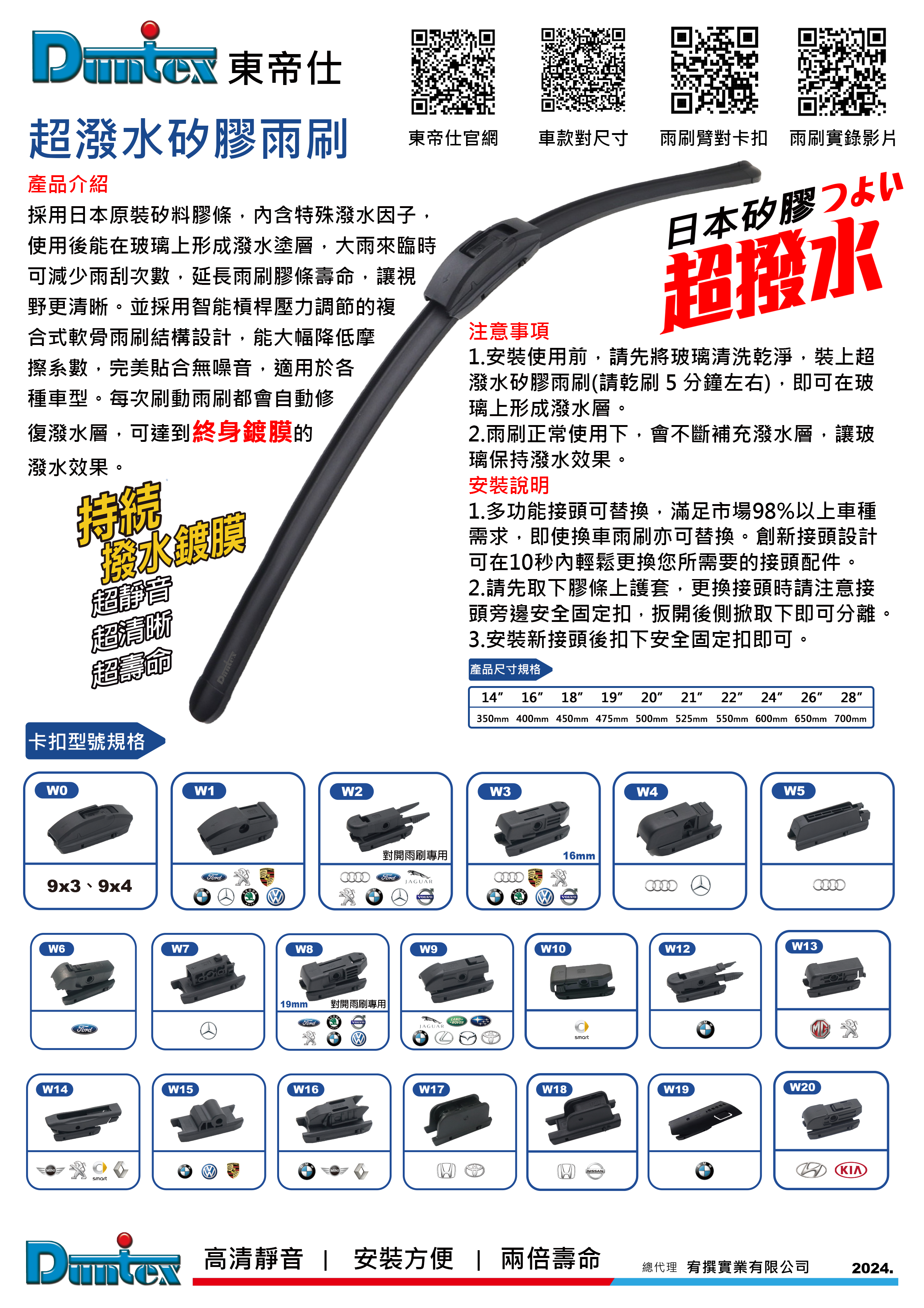 采用日本原装矽料胶条,胶条内含特殊泼水因子,雨刷刷动时,在玻璃表面形成泼水镀膜涂层,雨水会变成水珠弹起而滚落,让视野更清晰,可减少雨刷使用次数,延长胶条使用寿命。