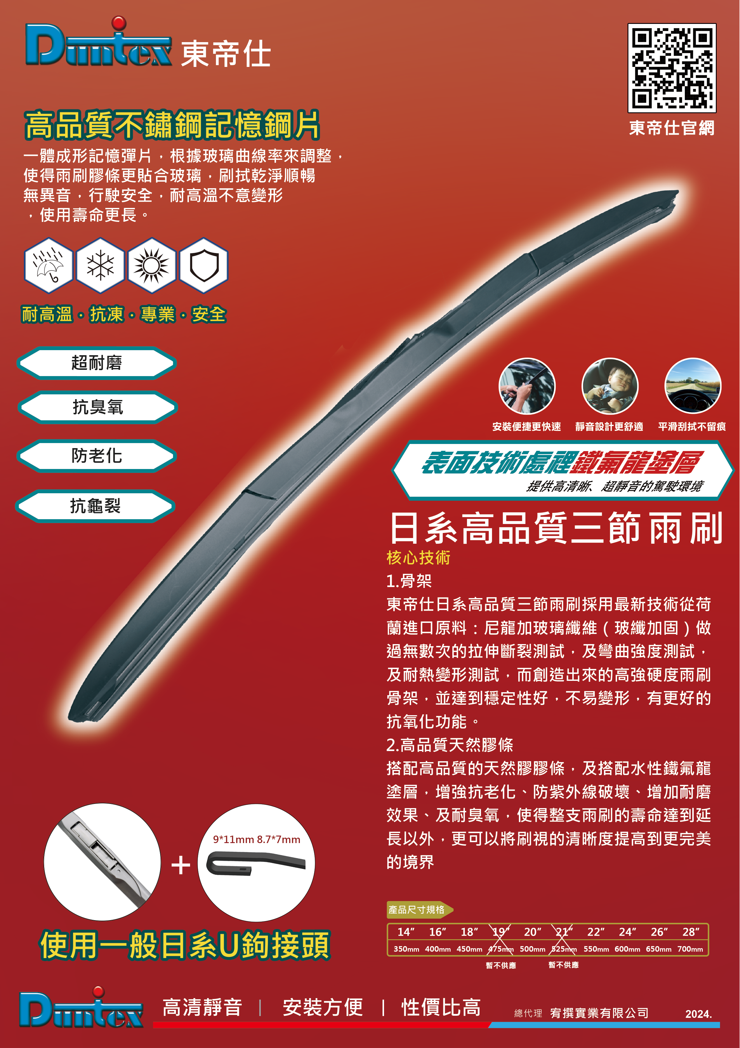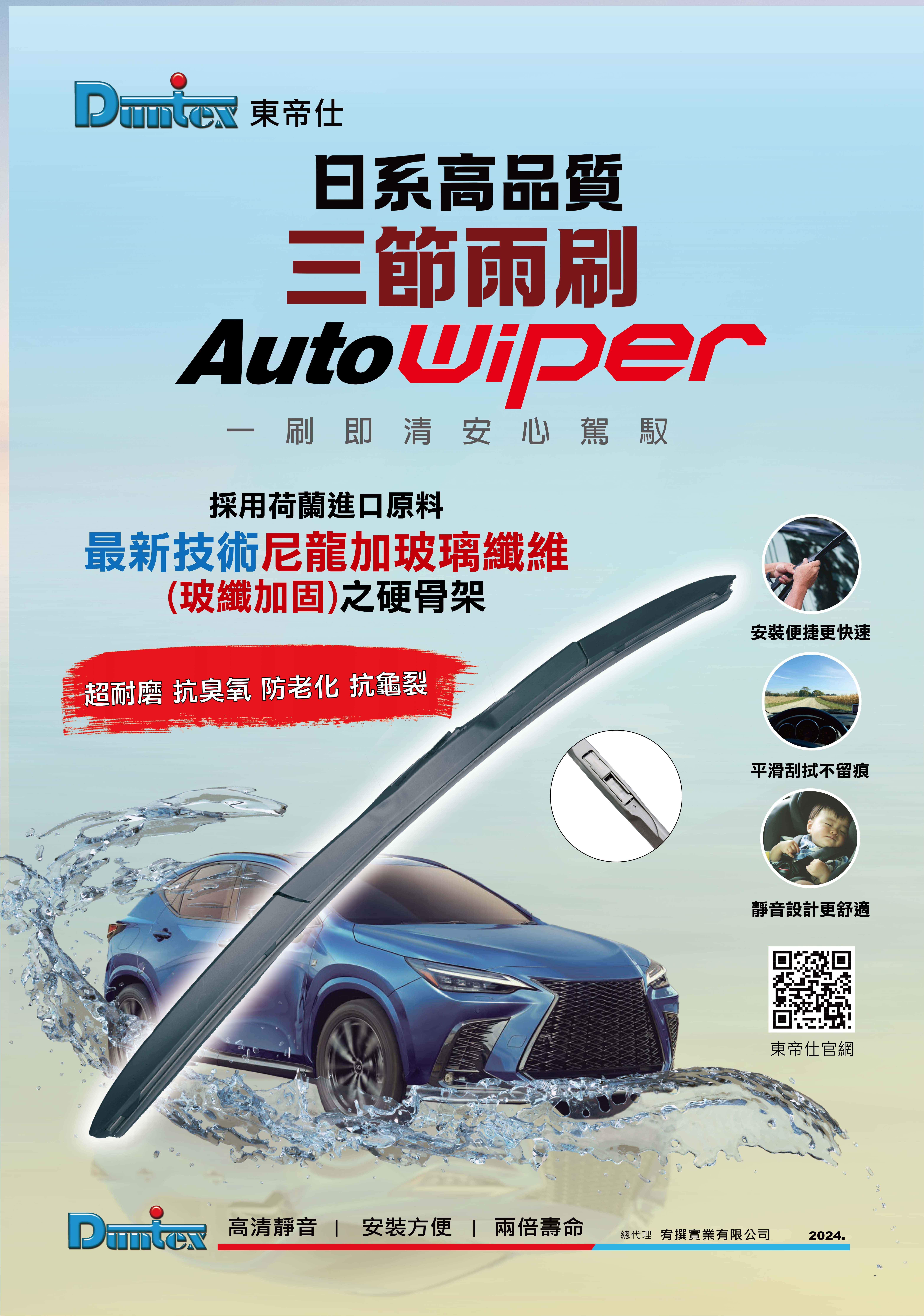 • 東帝仕日系三節雨刷採用荷蘭進口尼龍玻纖材質,經多重強度與耐熱測試,打造高硬度、不變形、抗氧化的穩定骨架。