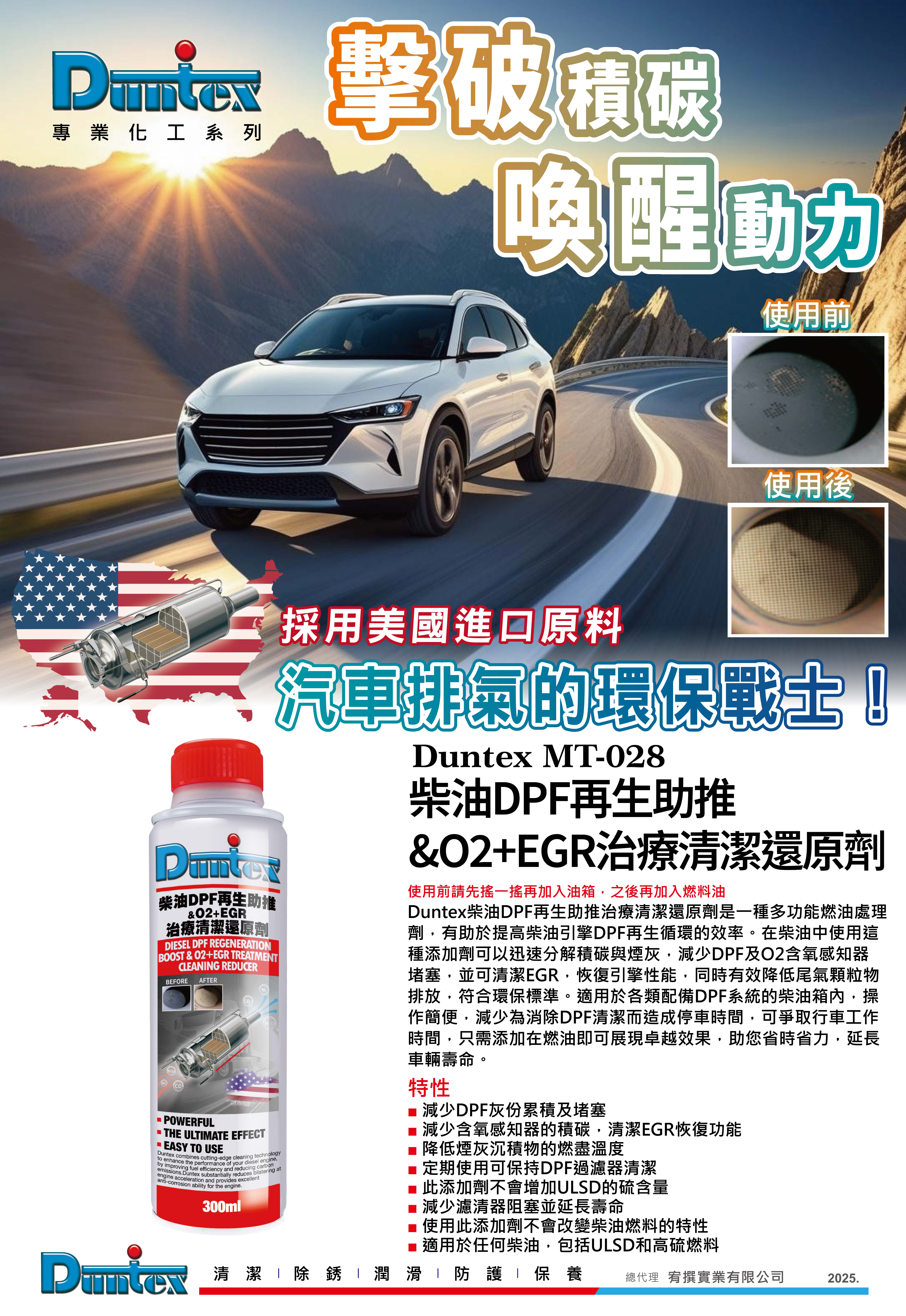 可提升柴油引擎DPF再生效率,快速分解積碳與煙灰,減少堵塞、恢復動力,降低排放、符合環保。適用各式DPF車輛,直接添加於柴油中即可發揮效果,操作簡單、省時省力,有效延長車輛壽命、減少停車保養時間。